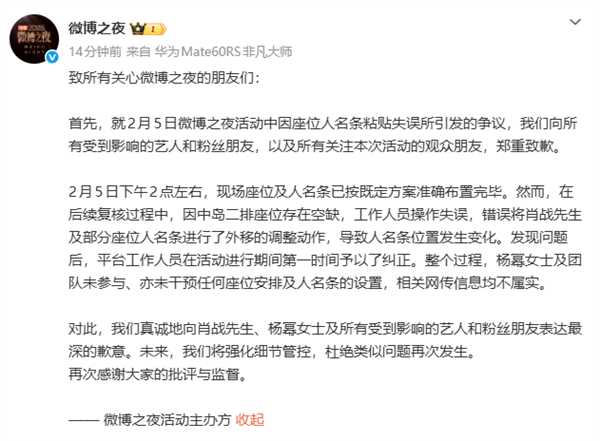 杨幂、肖和等艺人被卷入核心。向受影响的艺人、粉丝及关心勾当的报歉。就勾当期间座位人名条失误激发的争议,从办方申明:2月5日下战书2点摆布,工做人员已正在勾当过程中第一时间改正。对此,